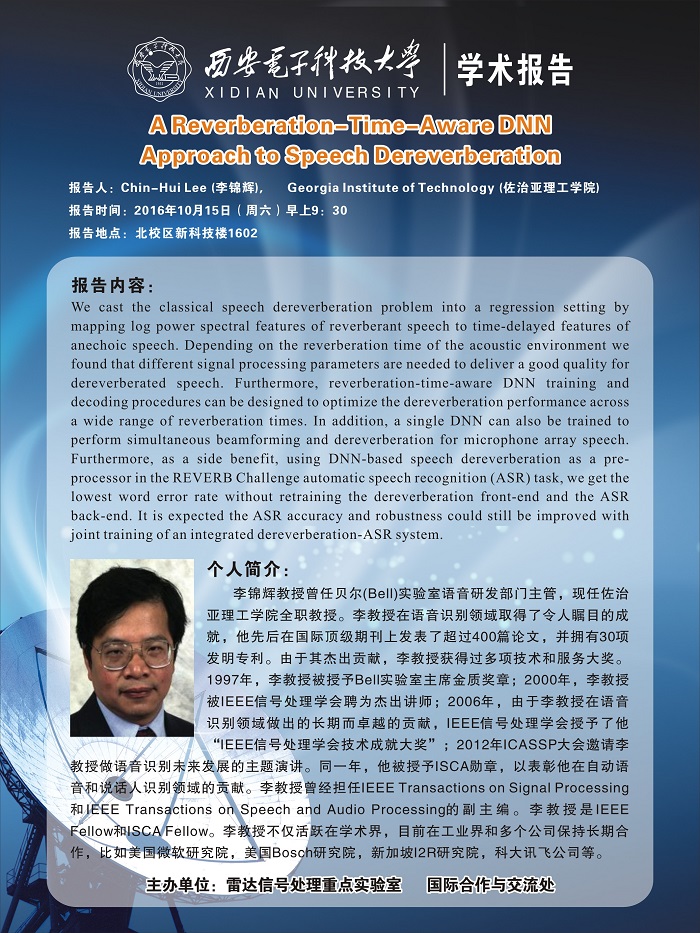 A Reverberation-Time-Aware DNN Approach to Speech Dereverberation2016-10-08 09:15:10浏览次数: 上一篇文章:新南威尔士大学学者贾秀萍来访下一篇文章:智能感知与图像理解教育部重点实验室第十七届学术周 暨“大数据的类脑计算与深度学习”国际研讨会