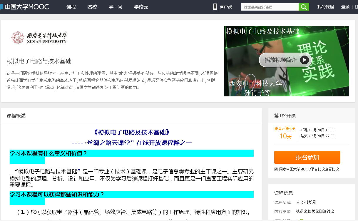 由我院国家级教学名师孙肖子教授和赵建勋教授主讲的中国大学MOOC课程《模拟电子电路与技术基础——“丝绸之路云课堂”在线开放课程群之一》已于3月13日在中国大学MOOC平台上线运作,将在3月28日开始授课。请点击以下链接观看课程介绍并报名参加: