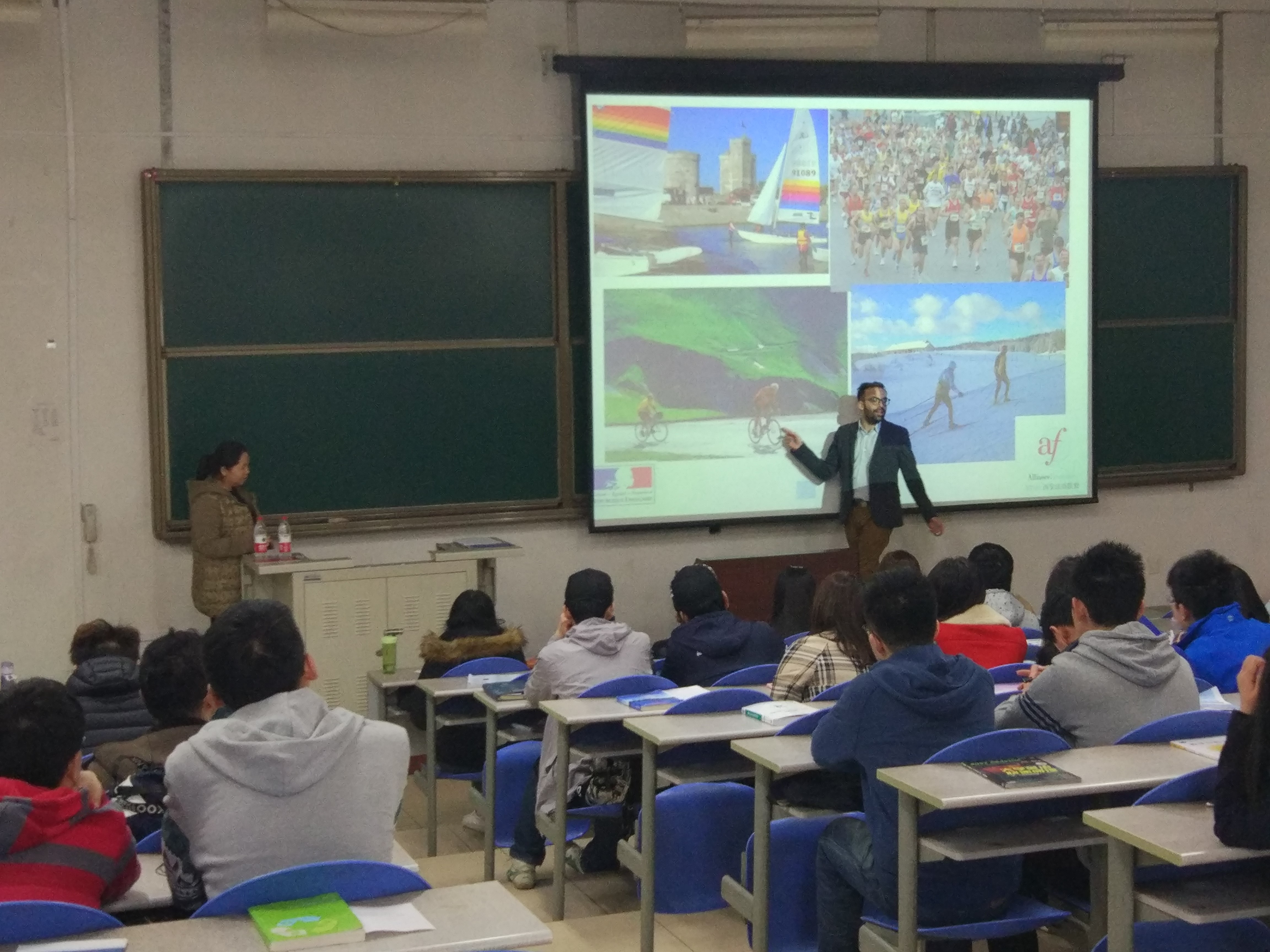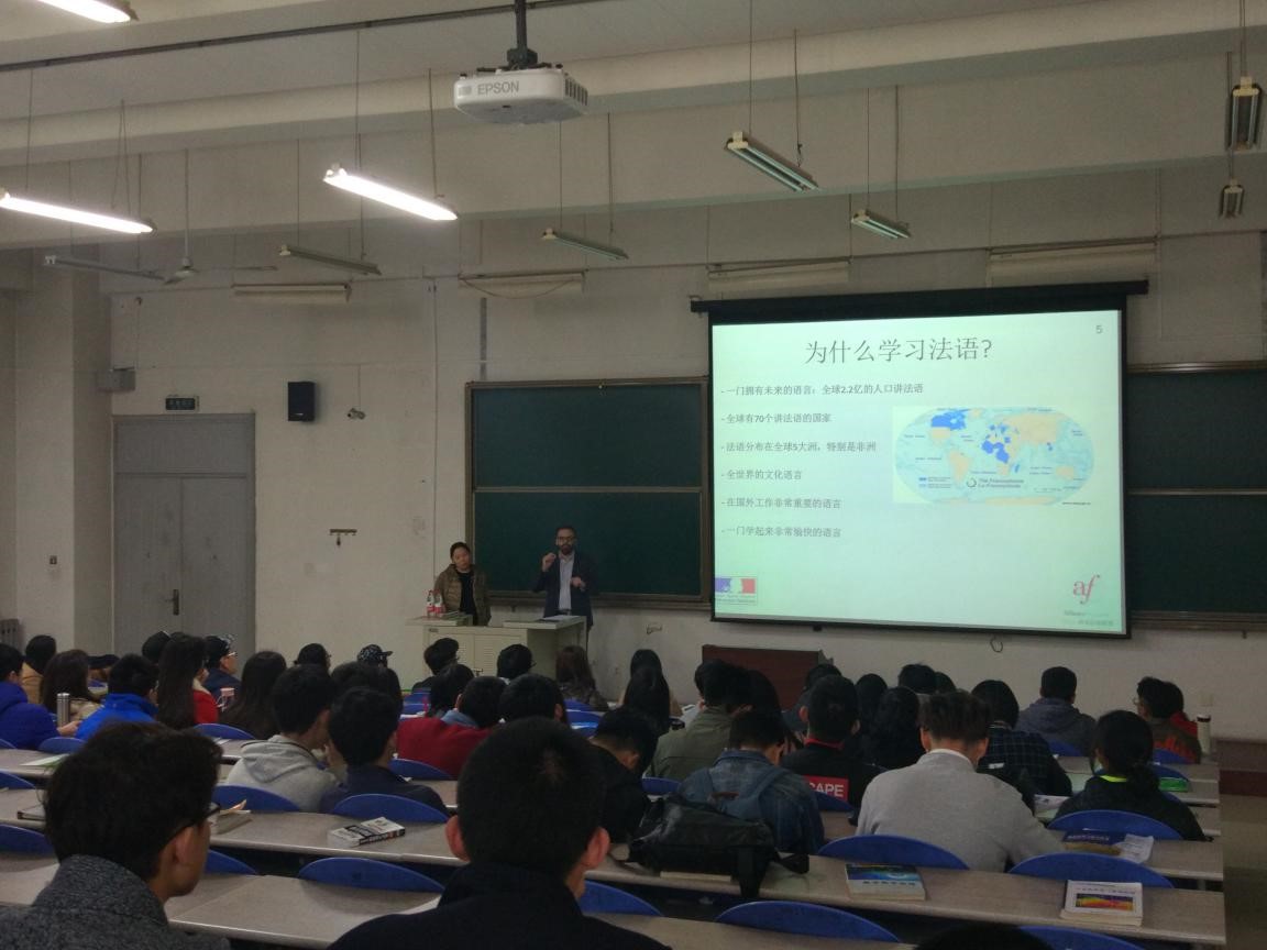 讲座在师生的掌声中开始,Nicolas先生从3月20日世界法语日讲起,为到场的同学细致而耐心地介绍了当代法国在科技、经济、文化等各个方面的基本情况,而后围绕法国教育的优越性及法语学习的要点进行了讲解。其中,关于法国著名企业、科技文化的内容引起了同学们的强烈兴趣和热切讨论,Nicolas先生的个人魅力深深地折服了在场的每位同学。