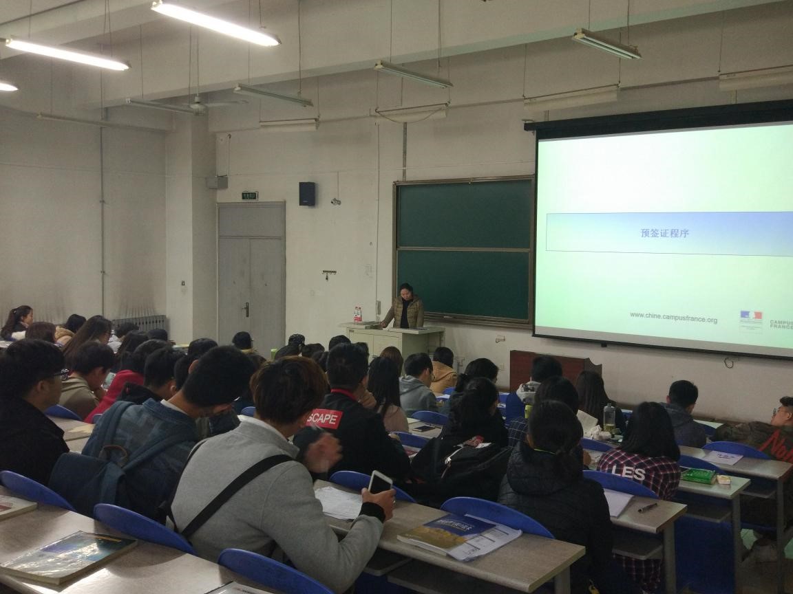 随后,中方主讲人穆锐女士凭着自己在中法教育界积累的经验和丰富的阅历,为学生们讲解及分析了许多法国留学的实际操作案例,重点讲解了法国高等教育情况;赴法留学预签证程序;留法签证新政策;法盟近期相关活动介绍等内容,并同时向电子信息工程专业的同学们提出几点希望:第一,希望同学们努力学习,提升专业技能和法语水平;第二,希望同学们注意关注法国高等教育署的通知,有任何问题都可以随时咨询。除此之外,穆老师从注册入学、社会保险、公共交通、就业形势等各个方面进行了全面的介绍,向即将赴法的学生提供了生活及学习上指导性的建议。一幅幅图表,一组组数据以及一张张鲜活的照片都让同学们对留学法国的情况有了更深入的理解,对自己的“法国梦”充满了无限的向往。