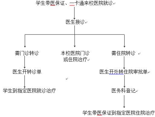 1. 本校学生首选在门诊定点医院即校医院就诊,如需要转诊的,由校医院医生开具转诊单,按转诊单上指定的医院及相关检查治疗内容在外就诊。原则上不许在外购药。