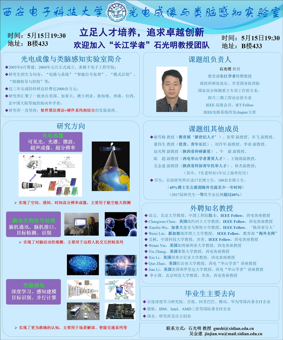 威尼斯光电成像与类脑感知实验室石光明教授团队2017研究生招生宣讲会2017-05-13 12:23:54浏览次数: 5月15号晚上7点30分光电成像与类脑感知实验室石光明教授团队将赴新校区B楼433进行研究生招生宣讲,欢迎各位有志于读研的同学前来参加! 详情请关注光电成像与类脑感知实验室2017宣讲微信群: 上一篇文章:西电故事|85岁彭学愚:1982年参与研制出中国第一台动目标检测器下一篇文章:威尼斯9499登录入口连续四年获学校“五四红旗团委”荣誉称号