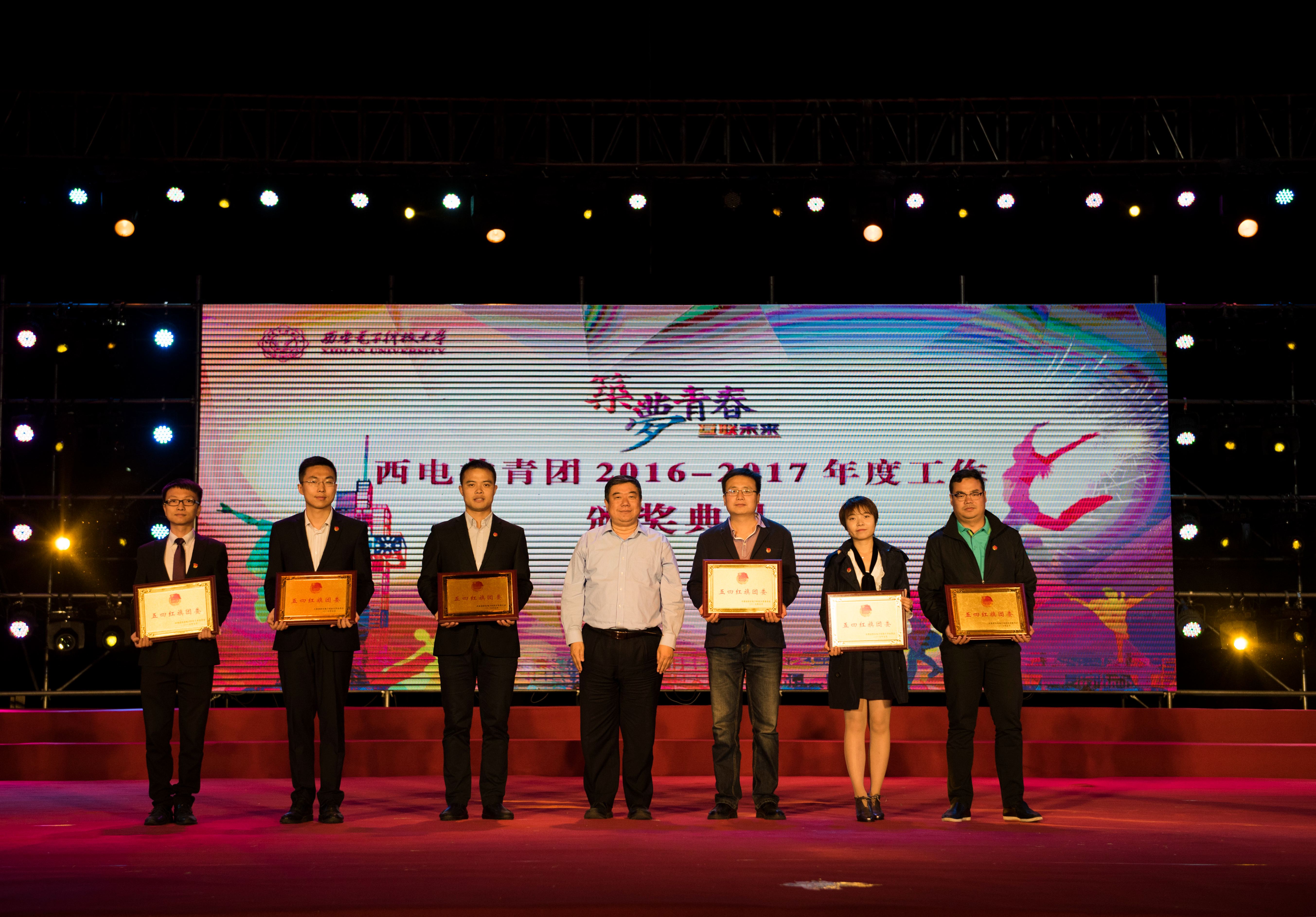 5月9日晚,学校“共筑青春互联未来”纪念五四青年节95周年文艺汇演暨共青团2016~2017年度工作颁奖典礼在西电南校区礼仪广场举行。党委副书记龙建成,副校长杨银堂,党委副书记、纪委书记蒋舜浩,与西电三千余名学子一同参加了颁奖典礼。