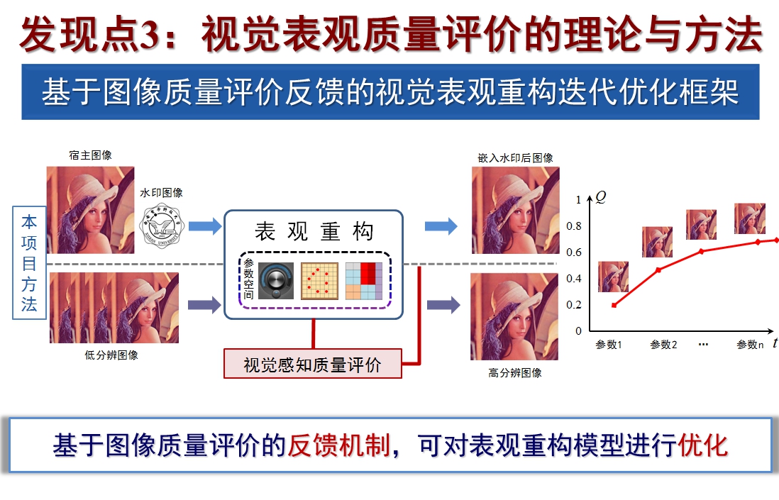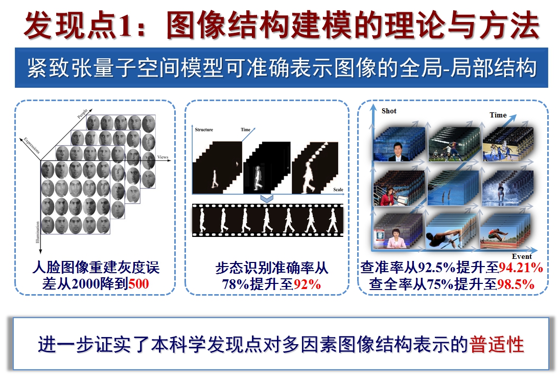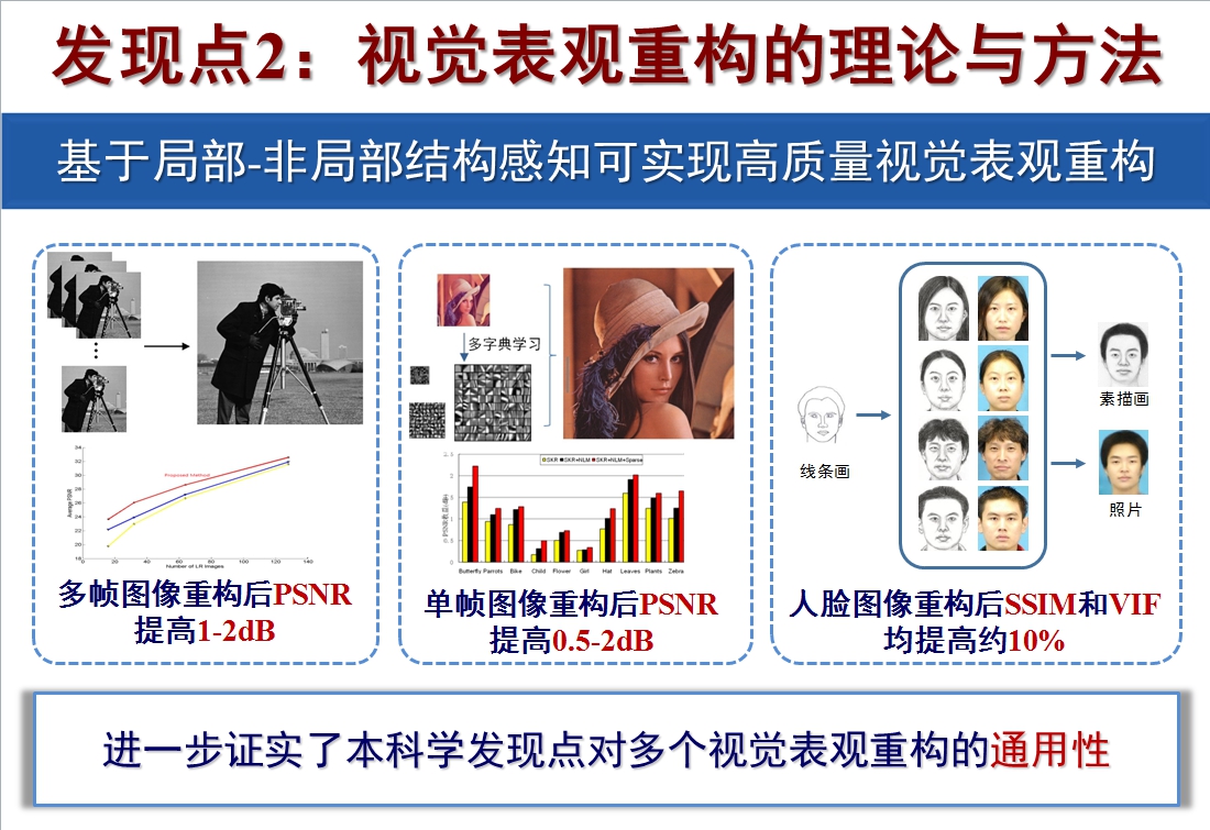 “项目立项之初,图像结构表示尚未建立完备的理论体系,视觉感知模型对图像结构的表示机理尚不明确;同时,视觉表观重构与图像结构表达和视觉感知机理之间的内在关系尚待发现。”令高新波感到欣慰的是,团队十余年来围绕这一基础问题展开的研究,最终取得突破。“团队建立起了图像结构的紧致张量表示模型,构建起视觉表观的非均匀重构框架,并基于视觉系统的通道选择性和掩蔽机理,建立起了图像质量评价模型。”