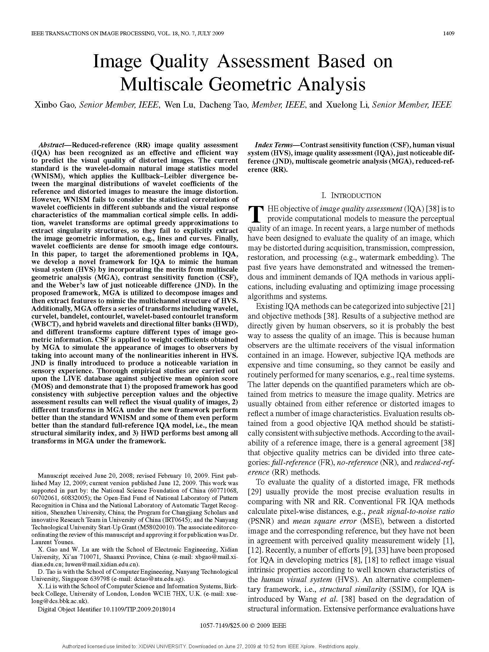 2008年,高新波与他的博士生路文,以及陶大程、李学龙合作撰写了论文“Image qualityassessment based on multiscale geometric analysis”,提出了基于多尺度几何分析的部分参考型图像质量评价的一种新测度。