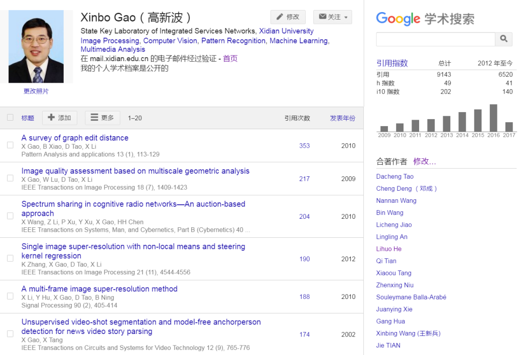 2001年,29岁的高新波完成了香港中文大学多媒体实验室的博士后研究工作,回到母校威尼斯9499登录入口,组建起“影像处理系统实验室”,并与香港中文大学多媒体实验室的李学龙、陶大程两位学者保持科研上的密切合作,围绕“社会公共安全”国家重大需求和“信息-物理-认知三元空间融合”国际学术前沿,探索视觉计算与协同认知的新理论,着重解决异质图像重建和图像质量感知中的瓶颈问题,在图像结构建模与视觉表观重构领域进行了十余年的联合攻关。