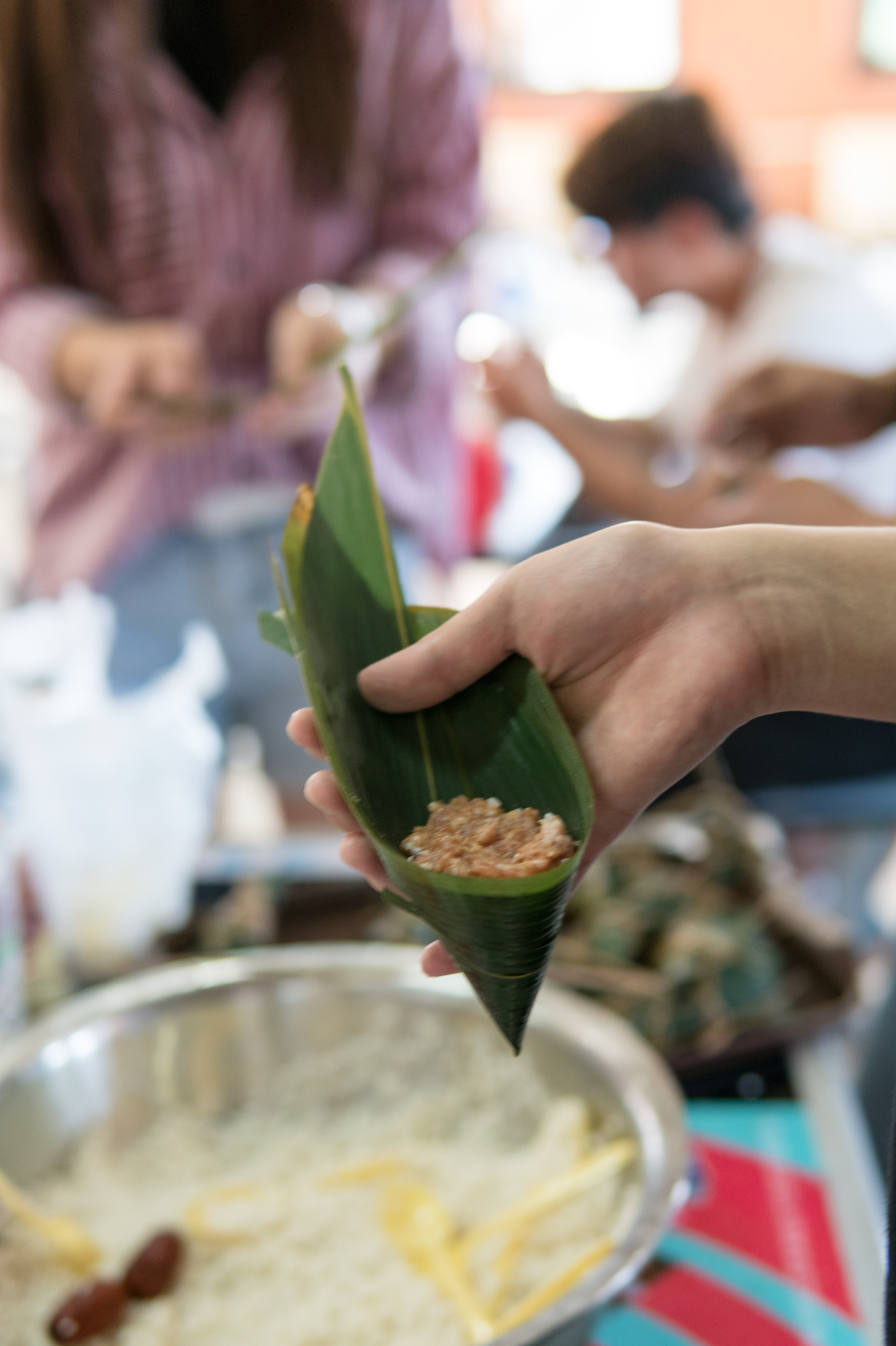 此次活动在海棠餐厅二楼举行,学生到齐后整理粽叶、糯米、蜜枣、鲜肉等食材,从包粽子环节开始切身体验端午文化。过程中学生们互相学习讨论,餐厅的工作人员也给予了指导。在一次次尝试后,学生们手法逐渐熟练,开始发挥创造,对传统粽子的形状进行改造。