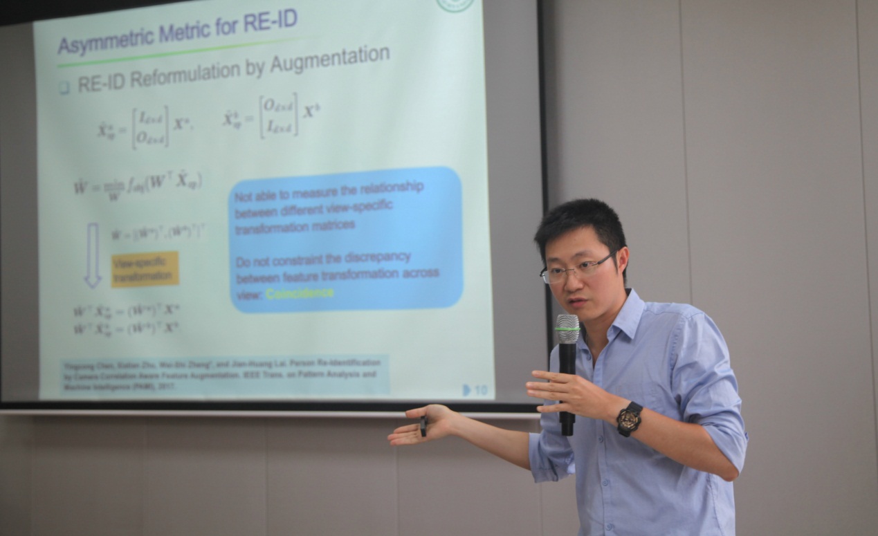 中山大学郑伟诗教授做了题为《非对称学习及其在行人重识别的应用》的报告。针对视频监控的跨模态和跨视角条件下识别准确率较低的问题,郑教授提出了利用非对称度量学习进行行人重识别的解决方法。