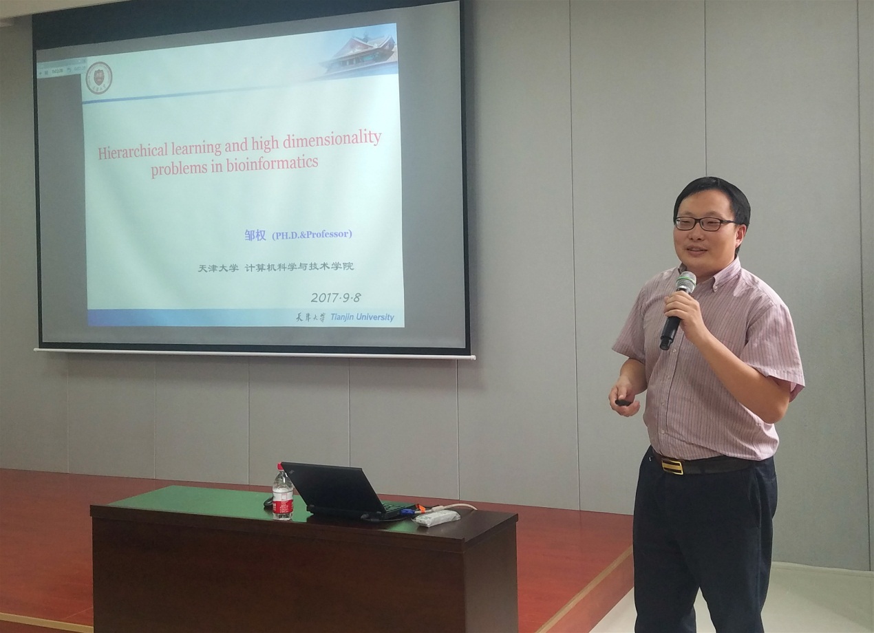 天津大学邹权教授做了题为《Hierarchical Learning and High Dimensionally Problems in Bioinformatics》的报告。邹权教授为在座师生详细介绍了蛋白质大分子序列的相关结构,针对蛋白质序列分类、酶的识别和microRNA等问题提出的基于机器学习的解决方法,以及机器学习在生物信息数据降维问题中的应用。
