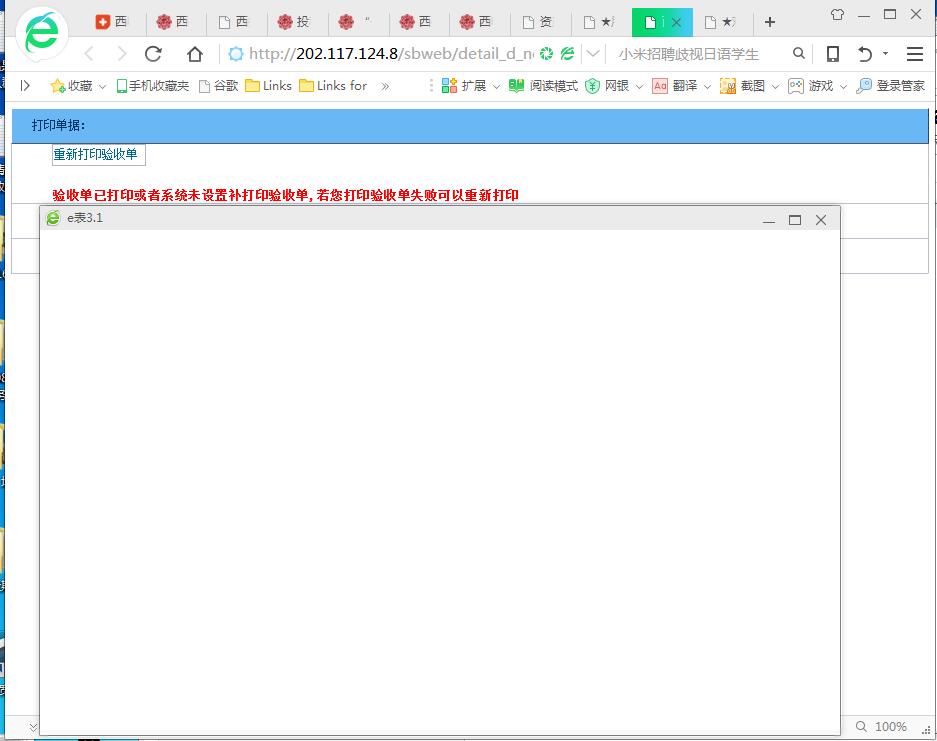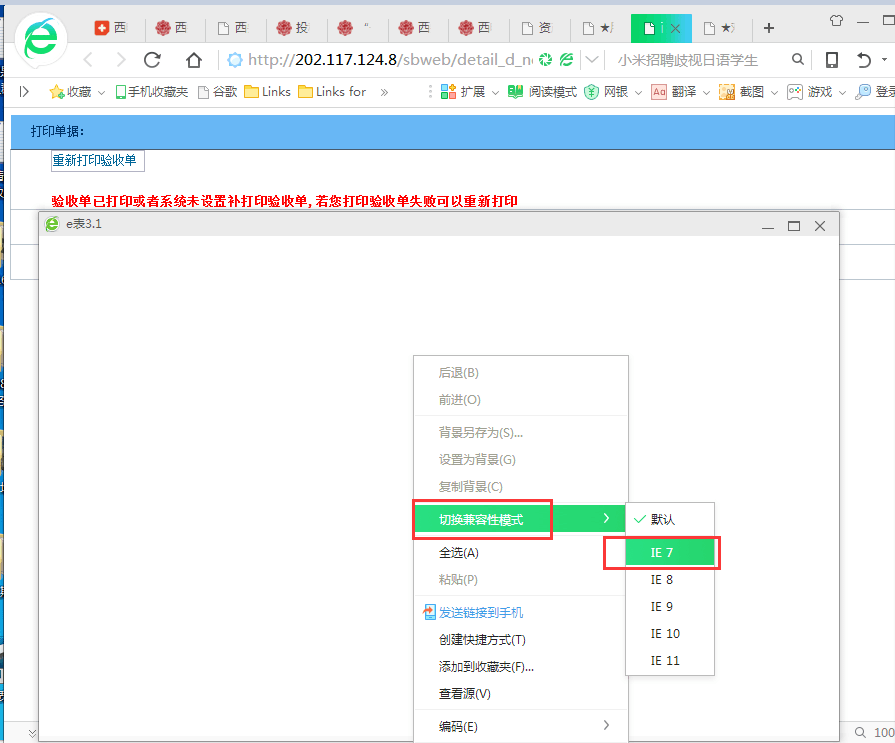 打印验收单 弹出白框 解决方法 是 把 浏览器切换到 IE7兼容模式