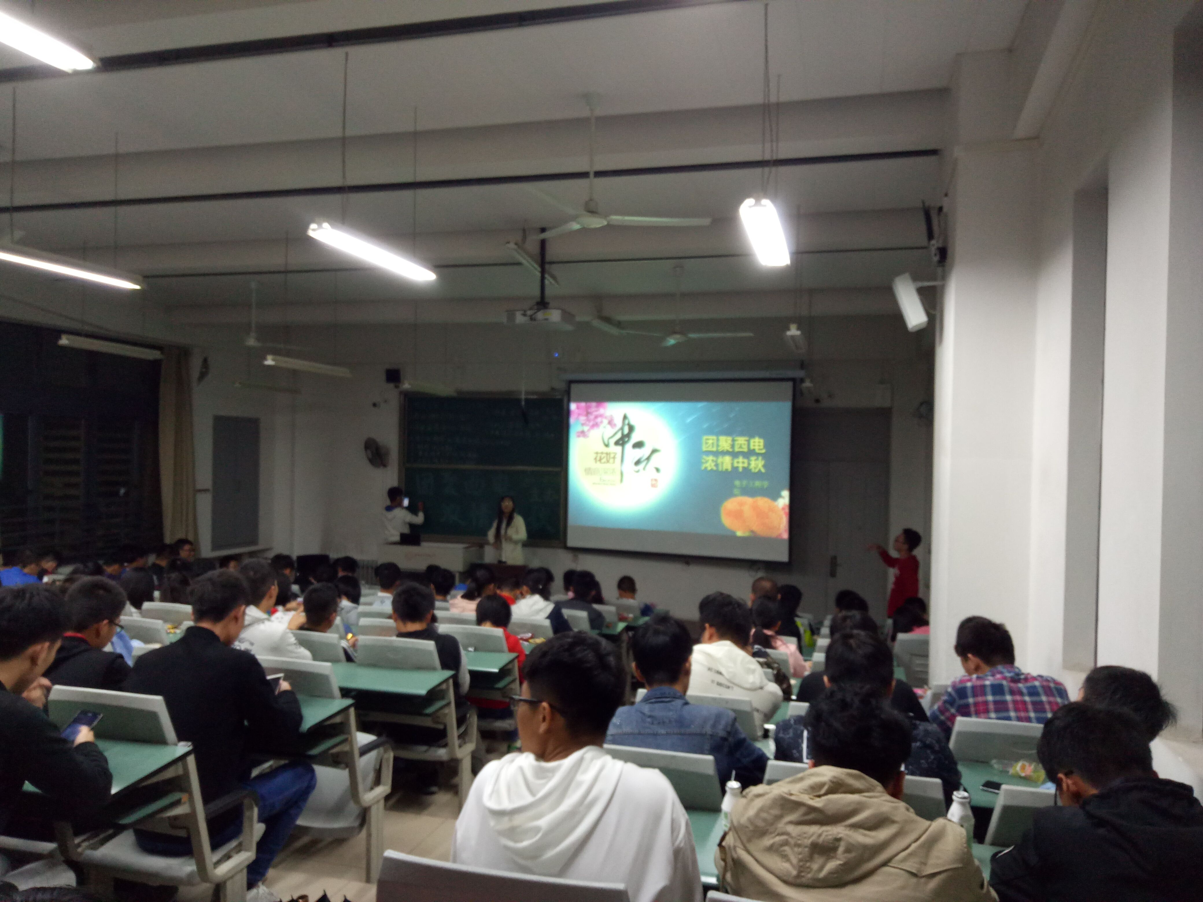 为了让同学们感到家的氛围,活动开始之前,学院为同学们准备了月饼和零食。活动由一个小游戏开始。首先给同学们每人发了一张贺卡,抽到彩色卡的同学得在大家面前展示自己的才艺。在大家的欢呼声中,抽到彩牌的同学一一表演了节目。在一个个生动有趣,诙谐幽默的节目的表演中,会场的气氛渐渐火热了起来,笑声和欢呼声充满了整个教室。每个人脸上都洋溢着甜美的笑容。同学们中秋不能归家的遗憾仿佛已经消解不少。
