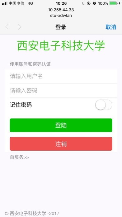 1.笔记本电脑或手机连接stu-wlan,弹出如下图所示页面(如果未自动弹出,请在浏览器输入10.255.44.33)