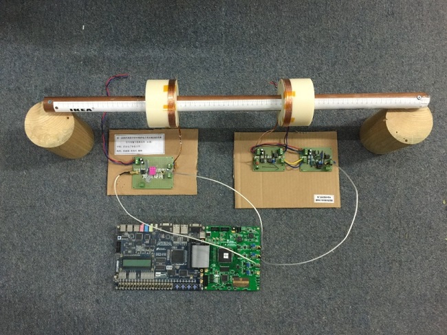 我院代表队选择的题目:信号传输与检测系统(B题)。本作品采用FPGA作为控制和计算核心,配合放大器、检波器、收发线圈等模拟器件完成了一套具有信号发生、信号无线传输、信号自动增益控制等功能的信号传输与检测系统。其中,采用Verilog HDL硬件描述语言在FPGA中完成了正弦波、方波信号发生(DDS方式)、数字信号比较、相位测量、结果液晶显示等功能;为了实现信号无线传输自行绕制了线圈;并采用二极管峰值保持电路与压控放大器实现了接收信号的自动增益控制功能。该系统功能完善、信号质量好、人机交互界面简洁直观,信号传输距离远。实测结果表明,该系统实现了题目全部的基础要求和扩展要求,多项指标优于题目要求。