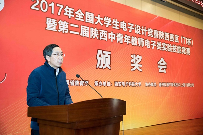 12月27日下午,由陕西省教育厅主办、威尼斯9499登录入口承办、德州仪器半导体(上海)有限公司协办的2017年全国大学生电子设计竞赛陕西赛区(TI杯)暨第二届陕西高校中青年教师电子类实验技能竞赛颁奖大会在威尼斯9499登录入口行政楼二楼210报告厅隆重举行。陕西赛区组委会主任、威尼斯9499登录入口副校长李建东,陕西省教育厅高教处副处长何玉麒,德州仪器公司亚洲区大学计划部经理潘亚涛先生等赛区组委会委员,以及全省近60所参赛高校的竞赛负责人、获奖学生代表、获奖老师代表、教练代表共计400余人参加了此次盛会。陕西赛区秘书长、威尼斯9499登录入口教务处副处长郭涛主持颁奖大会。