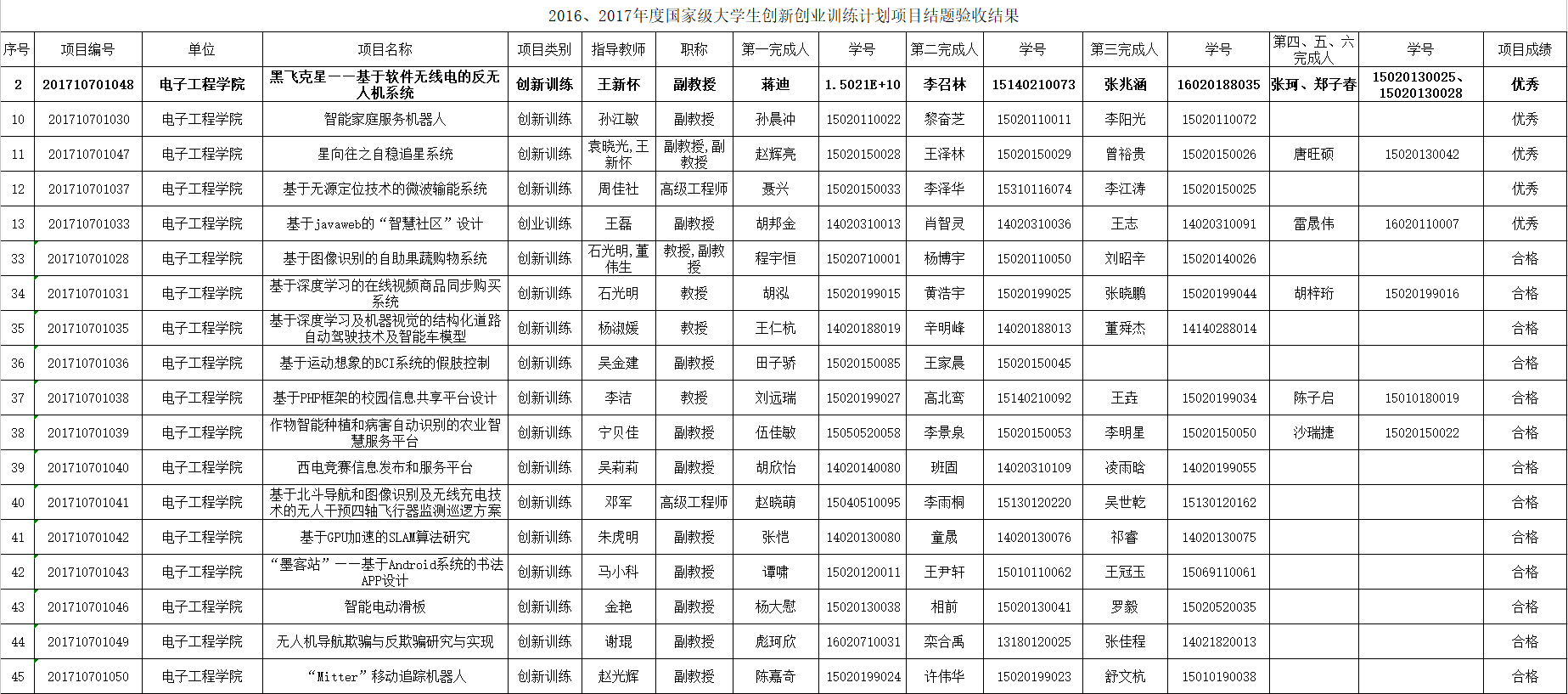 据了解,国家大学生创新创业训练计划是教育部在“十二五”期间提出的旨在促进高等学校转变教育思想观念,改革人才培养模式,强化创新创业能力训练,增强高校学生的创新能力和在创新基础上的创业能力,培养适应创新型国家建设需要的高水平创新人才的一项举措。从2007年至今,学校每年开展“大学生创新创业训练计划”,为学生的实践创新能力提高和开展研究性学习提供了支持。 以下是2016—2017年度国家级大学生创新创业训练计划项目我院项目结题验收的结果: