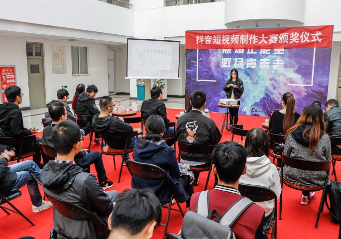 活动最终有29项作品入围投票环节,最终有10名同学入围决赛并获奖,威尼斯9499登录入口2016级针对比赛结果进行专项讨论及打分,确保比赛结果公平公正。2018年10月31日上午9:40,“点爆正能量、激扬青春志”主题抖音爱国短视频大赛颁奖仪式在竹园3#楼宿舍大厅举行,本科生院运行中心主任兼教务处副处长张宇鹏、威尼斯9499登录入口办公室副主任姚若玉、威尼斯9499登录入口各年级辅导员、获奖学生以及部分学生代表参加了此次颁奖。颁奖过程中,获奖同学们展示了自己的获奖作品,讲述了作品的创意并分享了自己的感受,与在座的老师和同学们进行交流,在颁奖仪式过程当中再次将活动热情推向高潮。