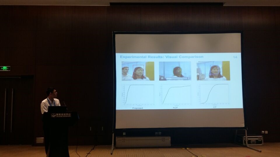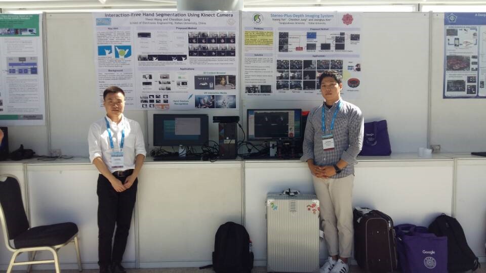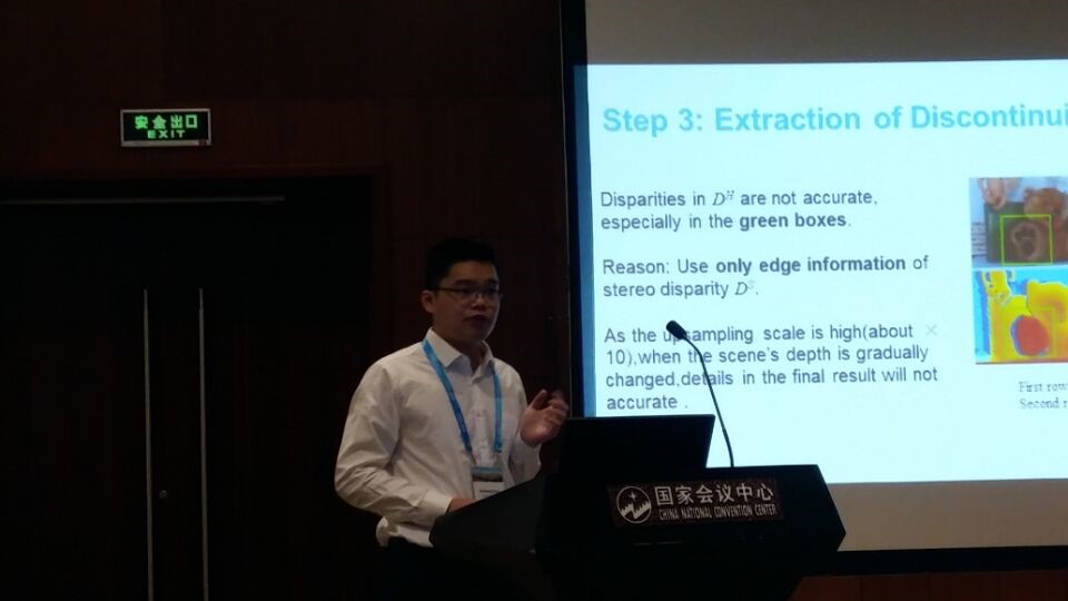 在本次会议上,王亦玮同学向大家介绍了自己的研究成果,作了题为《Interaction-free Hand Segmentation Using Kinect Camera》的Poster,主要内容是:实现了手形分割的自由交互新方式。郑喆坤教授,作了题为《Naturalness-Preserved Tone Mapping in Images Based on Perceptual Quantization》的Poster,主要内容是:基于人眼感知的图像增强技术。岑苗斌同学,作了题为《COMP-LOP: COMPLEX FORM OF LOCAL ORIENTATION PLANE FOR OBJECT TRACKING》的Oral,主要内容是:提出一种新的特征因子应用于目标跟踪中。陈宝亮同学,作了题为《Variational Fusion of Time-of-Flight and Stereo Data Using Edge Selective Joint Filtering》的Oral,主要内容是融合TOF和双目相机进行超分辨重建,获得一副高分辨的高质量的深度图像。