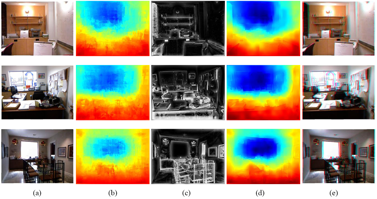 Fig. 1 Depth estimation and virtual view generation by the proposed method. (a) Query image. (b) Initial depth map. (c) Saliency map. (d) Refined depth map. (e) Red-cyan stereoscopic image.